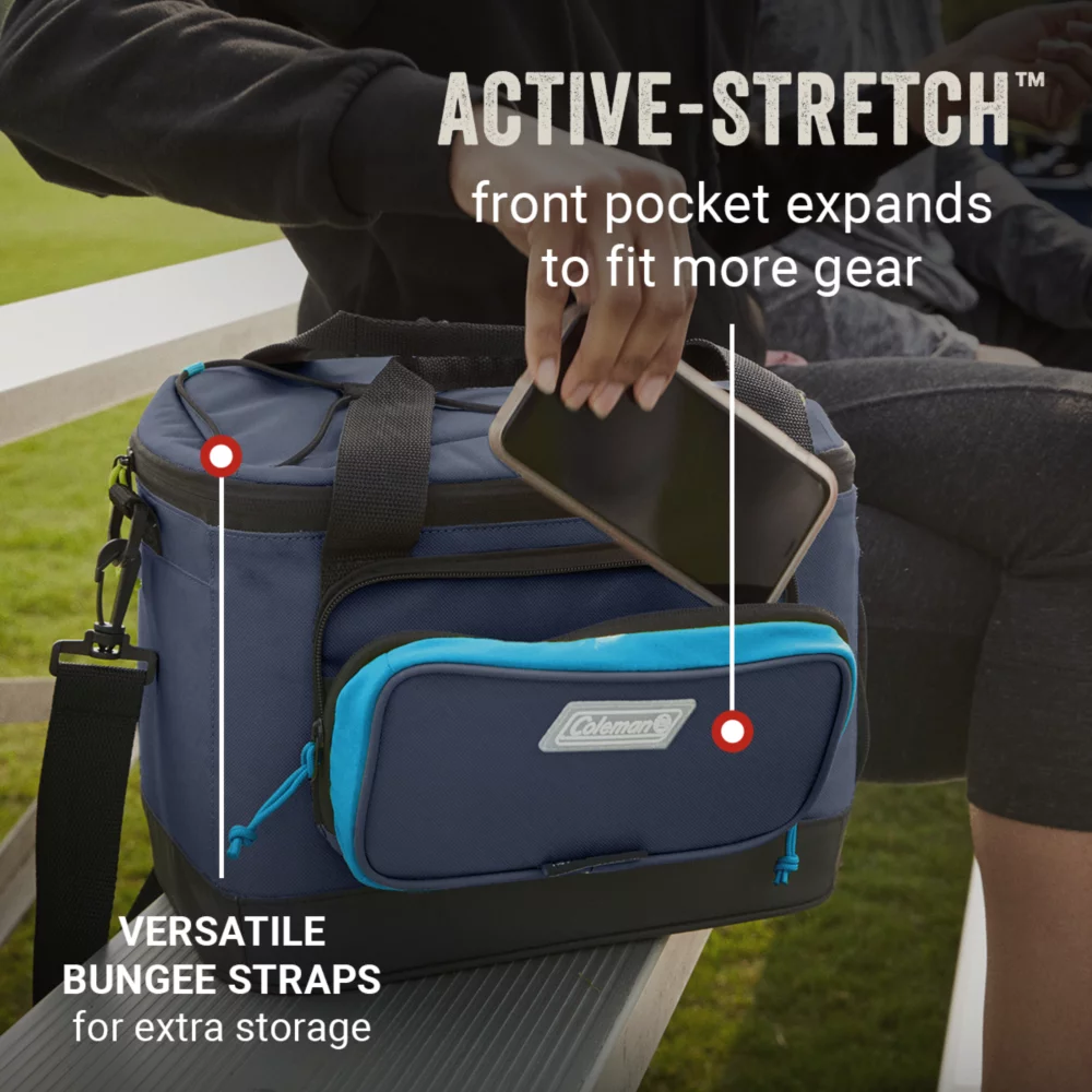 Spectating on the sidelines, tailgating with friends, or spending a day at the beach? The Coleman® XPAND™ 16-Can Soft Cooler is the perfect cooler for you and your crew. Active-Stretch™ front pocket expands to fit all your gear throughout the day so you can grab your phone, keys, or other personal items with no problem and the 4Way stretch side mesh pocket easily fits a water bottle. The padded top handle makes the cooler easy to carry from your car to the beach or the sidelines. All-day tailgating? Food and drinks stay cold up to 24 hours so you’ll always have your favorite snacks and beverages at hand. You can feel confident using this cooler again and again thanks to the antimicrobial leakproof liner that helps prevent odor, mildew, and mold from forming.